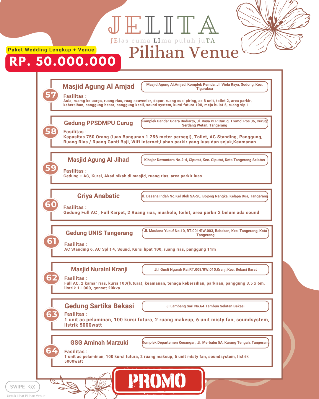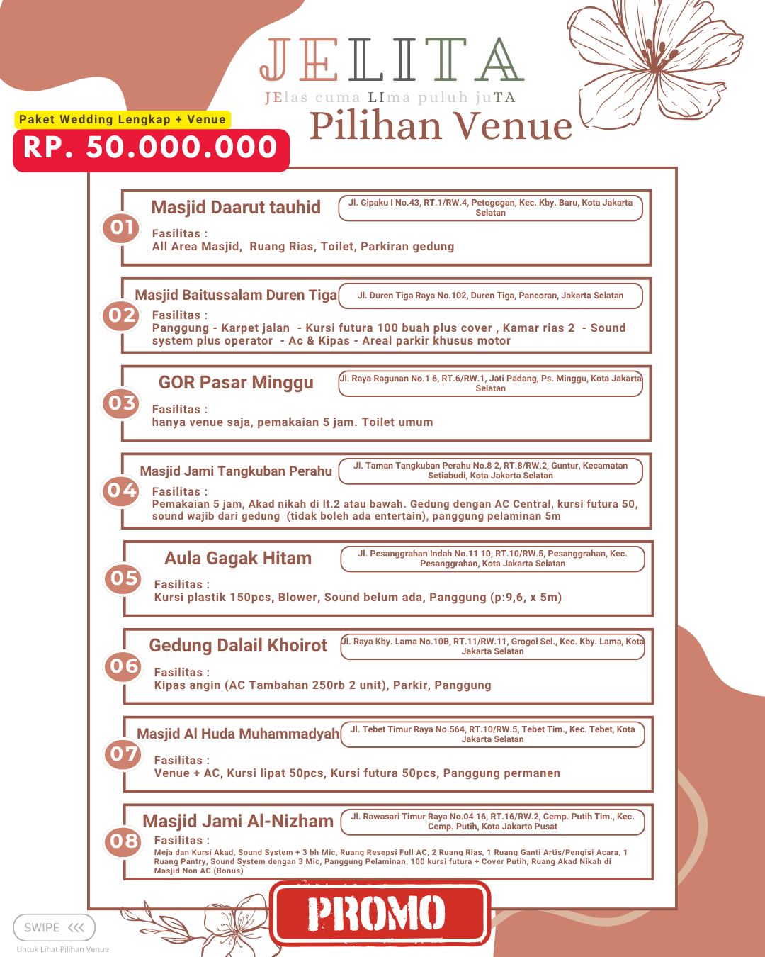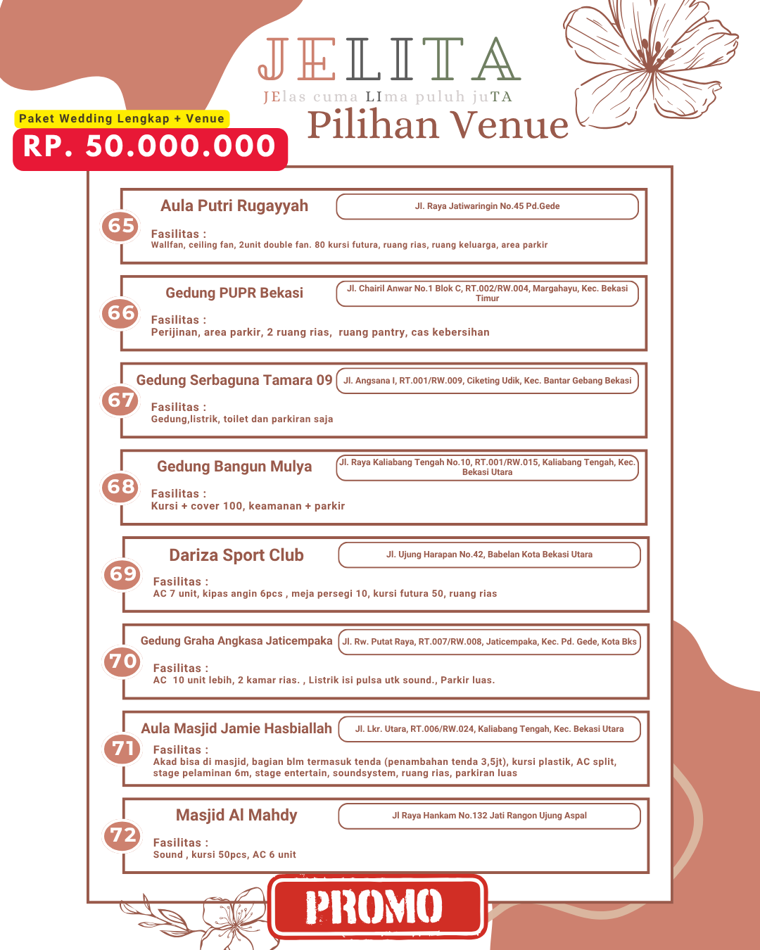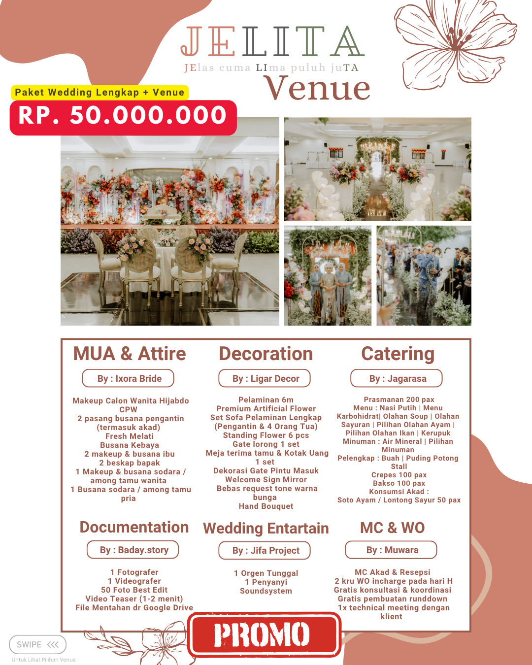 Jagarasa.id memahami kebutuhan ini dengan menyediakan berbagai pilihan paket wedding intimate di kawasan Jabodetabek, yang mencakup Jakarta, Bogor, Depok, Tangerang, hingga Bekasi. Promo yang ditawarkan dirancang untuk membantu pasangan yang ingin meraih pernikahan impian mereka tanpa harus menghadapi stres dan biaya yang berlebihan. Dengan paket wedding intimate dari Jagarasa.id, setiap elemen pernikahan dapat disesuaikan dengan keinginan pasangan. Ini menjadikan Jagarasa.id pilihan yang menarik dan solusi tepat bagi mereka yang merencanakan pernikahan berkesan namun tetap sederhana.