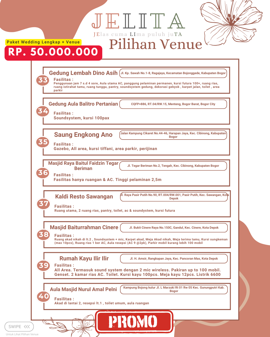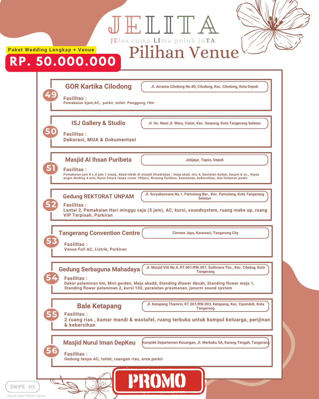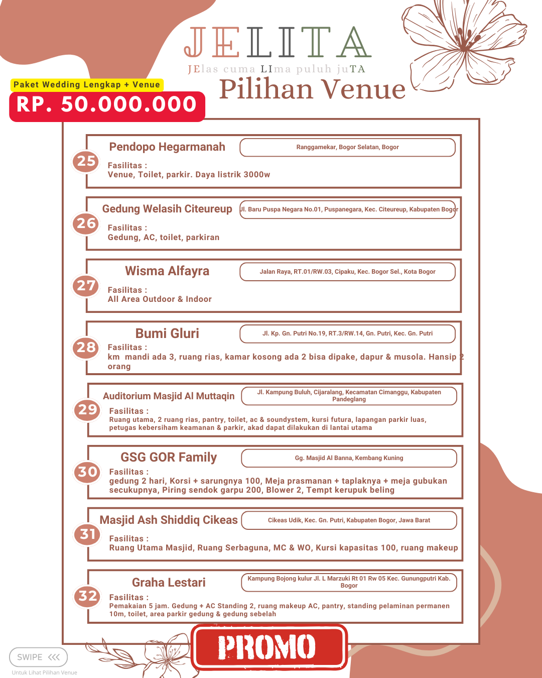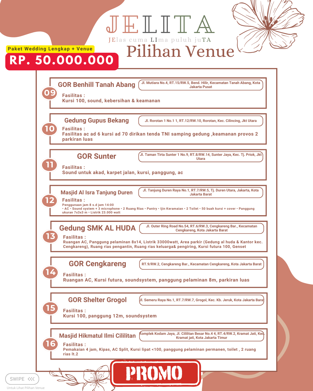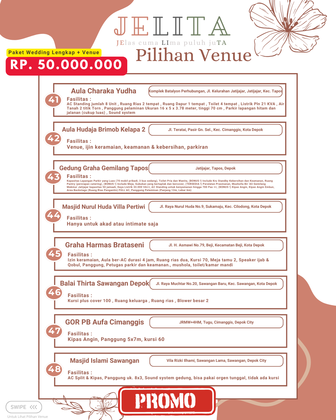 Jagarasa.id memahami kebutuhan ini dengan menyediakan berbagai pilihan paket wedding intimate di kawasan Jabodetabek, yang mencakup Jakarta, Bogor, Depok, Tangerang, hingga Bekasi. Promo yang ditawarkan dirancang untuk membantu pasangan yang ingin meraih pernikahan impian mereka tanpa harus menghadapi stres dan biaya yang berlebihan. Dengan paket wedding intimate dari Jagarasa.id, setiap elemen pernikahan dapat disesuaikan dengan keinginan pasangan. Ini menjadikan Jagarasa.id pilihan yang menarik dan solusi tepat bagi mereka yang merencanakan pernikahan berkesan namun tetap sederhana.